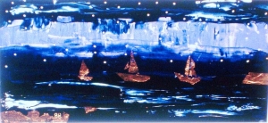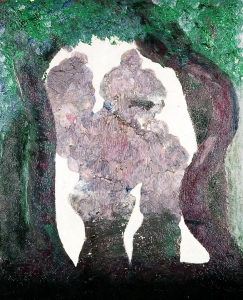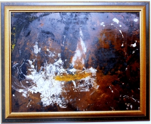 There is a white explosion in a thick, dark brown night, a vaguely triangular shape. This one is so dramatic that one would like to call it “Cataclysm”, or “Nightmare”, or “Night of Hideous White”, or “Leukemia”. Clichés! “What’s the picture called, Pedro?”