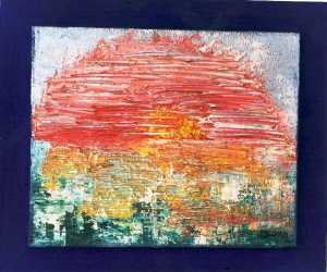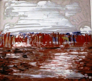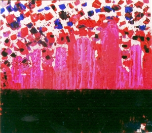 There is a picture of pink vertical strokes, planted on a green surface. Apartment blocks? Ears of corn? Simple strips of colour? Maybe. Above these strokes, a profusion of bright blotches, maybe. A whole tendency in modern thought is there: not such and such a thing, but “maybe-things” – maybe Manhattan, maybe a cornfield, or all of the above; a firework, for example. (The picture is called “Pollution.)