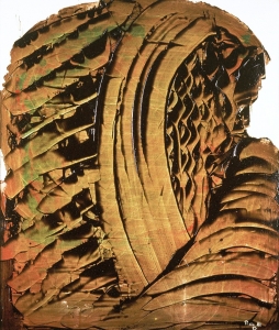 There is an Indian Chief in monochrome (Vandyke brown), like a clay mask applied to the canvas. (The canvases, I should explain, consist of aluminium offset plates.)