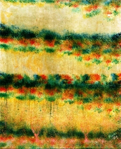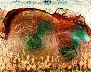 There is a picture made by a couple’s bare, dancing feet, treading in the paint. Instead of the tiresome mess one might have expected, the painting comprises a splash that recalls two bodies dancing through foliage. By what tortuous route such squelching about manage to produce such a painting is no less mysterious than this: from the vat where grape pickers tread a slimy pulp – will come wine.