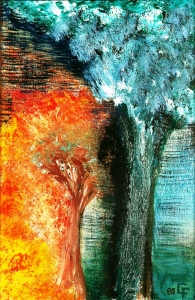 One is bursting with green, the other with red. “My brother sees two trees badly drawn; that’s his right. They are only a couple of trees, after all. He’s probably right. “Such modesty, Pedro! I see a tree on fire, a tree amid drama (the artist grappling with his passion?) and a tree rejoicing in its spring chlorophyll. Side by side. Where the academic painter would have produced a sumptuous “Forest Fire” so real it has you reaching for the extinguisher, and a no less sumptuous “Spring Forest” on a separate canvas, Pedro’s genius was to bring together two opposing subjects on the same one. Imagine two orchestras simultaneously playing Vivaldi’s “Spring” and “Summer”. A primitive painter, yes. A painter who cannot draw, yes. (I am reminded of Baudelaire on the Painter of Modern Life: “He drew like a barbarian, like a child...”) Thus a painter who feels primitive forces, those of the tree exultant with sap and the tree in agony, and so a painter with strong feelings like a child. A Heraclitean painter.